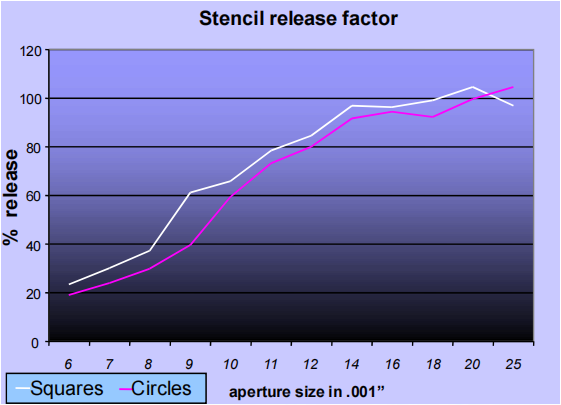 測試數據表明,對于小孔徑,方形孔表現要比圓形孔要好,如下圖所示(結果來自于一個0.005”的電鑄鋼網)